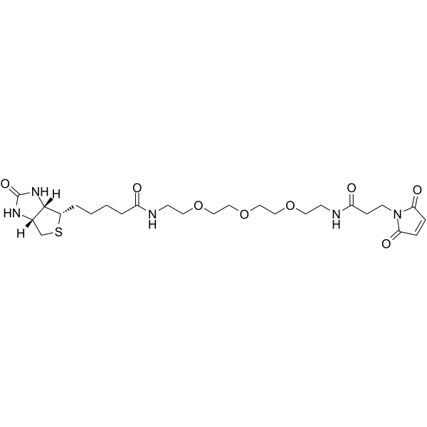 Biotine-PEG3-Mal, met CAS-nummer 1431618-70-0, is een essentieel synthetisch reagens voor geavanceerde bioconjugatiechemie. Dit molecuul overbrugt biologische systemen en synthetische materialen, wat nieuwe onderzoeksmogelijkheden creĂ«ert. Het ontwerp van Biotine-PEG3-Mal combineert de hoge affiniteit van biotine, de flexibiliteit van een PEG3-spacer, en de selectieve reactiviteit van een maleĂ¯midegroep. Dit maakt het onmisbaar voor wetenschappers in biomaterialen, diagnostische assays en gerichte medicijnafgifte. Hoge zuiverheid staat garant voor betrouwbare resultaten, cruciaal voor wetenschappelijke integriteit.