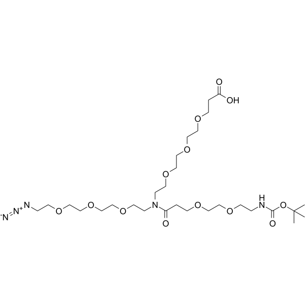 Dit specifieke PEG-derivaat, N-(Azido-PEG3)-N-(PEG2-NH-Boc)-PEG3-acid, is zorgvuldig ontworpen om een scala aan chemische functionaliteiten te bieden. De aanwezigheid van een azidogroep maakt klikchemie-reacties (zoals de koper(I)-gekatalyseerde azid-alkyn cycloadditie, CuAAC) mogelijk. Dit is een uiterst efficiënte en orthogonale methode voor het covalent koppelen van moleculen. De Boc-beschermde aminegroep kan selectief worden gedeprotecteerd om een primaire amine te onthullen. Dit maakt verdere functionalisering of conjugatie via amidebindingen of reductieve aminering mogelijk. Tot slot biedt de carboxygroep een verdere ankerpunt voor koppeling aan hydroxyl- of aminefunctionaliteiten. Dit drievoudige functionaliteitsprofiel maakt de verbinding uitzonderlijk veelzijdig voor het synthetiseren van complexe, op maat gemaakte moleculaire constructies.