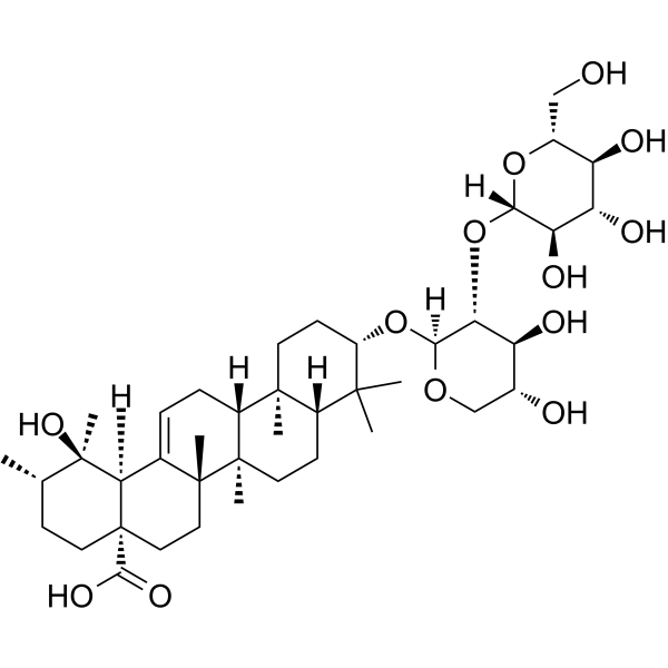 Ilexoside D, met CAS-nummer 109008-27-7, is een fascinerend triterpeen-saponine dat voornamelijk wordt geĂ¯soleerd uit planten van het Ilex-geslacht, zoals Ilex pubescens. Deze verbinding staat bekend om zijn complexe moleculaire structuur en de diverse biologische activiteiten die eraan worden toegeschreven. Het heeft een molecuulformule van C54H88O23, wat duidt op een aanzienlijke complexiteit.