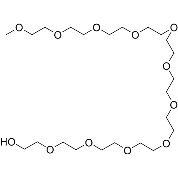 m-PEG11-OH staat voor methoxy-poly(ethyleenglycol) met elf herhalende ethyleenglycol-eenheden en een terminale hydroxylgroep (-OH). Deze lineaire polymeer is een bijzonder waardevolle building block in de organische synthese. Bovendien biedt het uitstekende eigenschappen voor bioconjugatie en oppervlaktemodificatie, dankzij de reactieve hydroxylgroep en de hydrofiele PEG-keten.